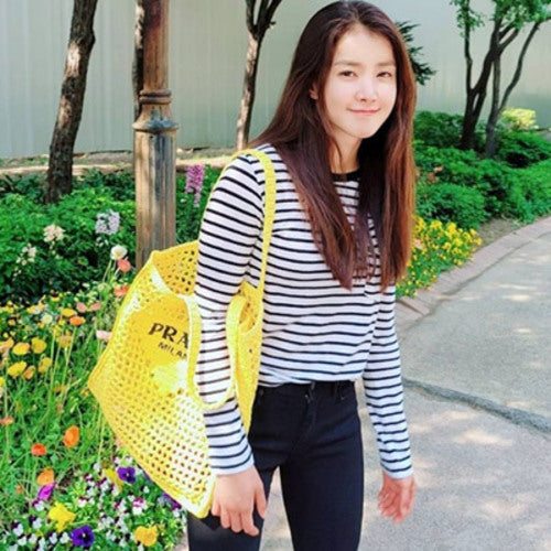 정교하게 이어진 라피아 짜임과 내추럴한 프라다 자수 로고까지