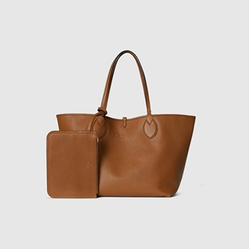 심플한 핸들과 섬세한 로고 각인, 내부 파우치 구성,