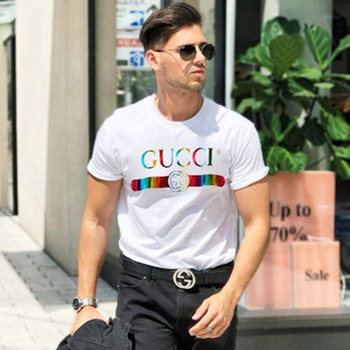 구찌에서 출시된 메탈릭 로고 프린트 반팔티입니다