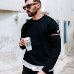 크루넥 라인과 소매의 시그니처 로고 암밴드,